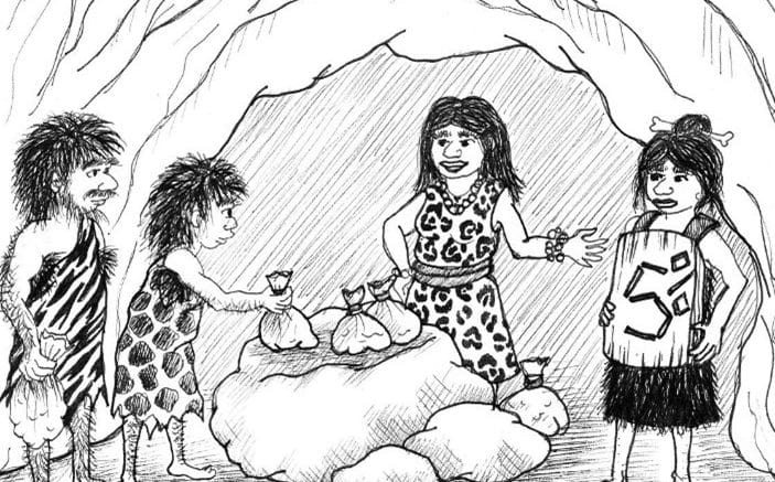 - Our cavemen use shells as money – they trade these rare trinkets in return for food, clothes and tools.
